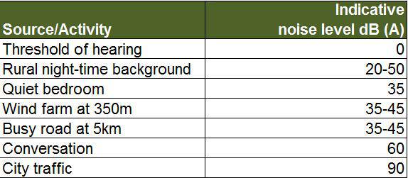 As the blades are rotating, one can hear a smooth swooshing sound. Nothing really disturbing. Sometimes when standing close to the tower, the actions and movement of the gearbox and generator may also be faintly audible. It is also true that a turbine’s audibility increases with wind speed but the wind’s background noise rises more quickly and masks the noise from the wind turbines. Here a few references points for comparison: