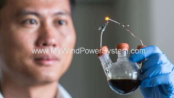 To demonstrate their new battery, the researchers created a miniature system using glassware. Adding a lithium polysulfide solution to the flask immediately produced electricity that lit up an LED. A commercial version of the new battery would be scaled up to store many megawatt-hours of energy. The next step is to make a laboratory-scale system to optimize its energy storage process and identify potential engineering issues, and at the same time to start discussions with potential hosts for a full-scale field-demonstration unit.